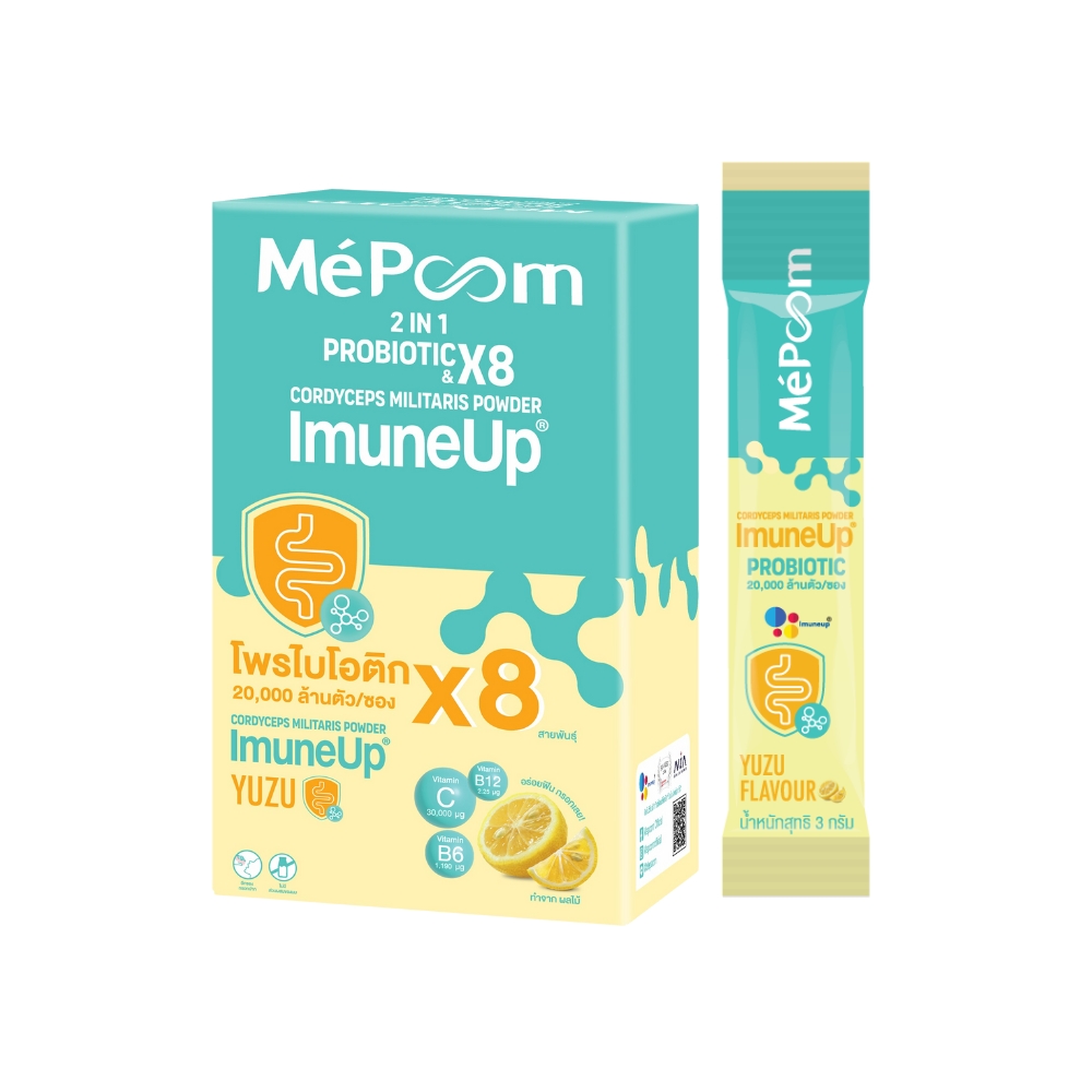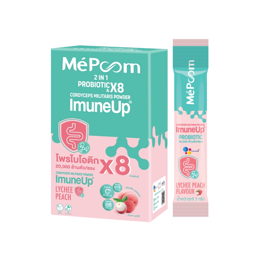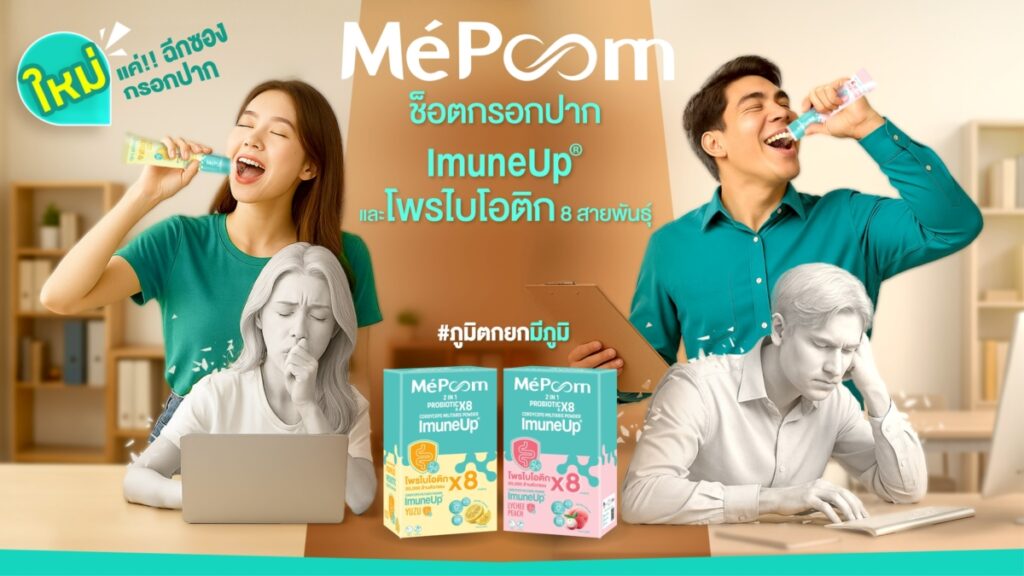 บริษัท เถ้าแก่น้อย ฟู้ดแอนด์มาร์เก็ตติ้ง จำกัด เปิดตัวผลิตภัณฑ์เสริมอาหารนวัตกรรมใหม่ MePoonn ช็อต มีภูมิ ที่รวมพลัง สารสกัดจากถั่งเช่าสีทอง (ImmuneUp® Powder Mycelium) นวัตกรรมแรกของโลกเพื่อเสริมสร้างภูมิคุ้มกัน และ โพรไบโอติก 8 สายพันธุ์ ที่เหมาะกับลำไส้ของคนไทยสายกินรสจัด แตกต่างด้วยรูปแบบ “ช็อตกรอกปาก” ที่ทานง่าย ไม่ต้องผสมน้ำ เพียงวันละ 1 ซอง ช่วยเพิ่มภูมิคุ้มกันและดูแลสุขภาพได้จากภายในMePoonn แตกต่างด้วยการใช้ ImmuneUp Powder® ซึ่งมี ไมซีเลียมถั่งเช่าสีทอง เปรียบเสมือนสารเสริมภูมิคุ้มกันตามธรรมชาติ ที่ผ่านการศึกษาทางคลินิกและผลวิจัยจริงในมนุษย์ว่าช่วยเสริมสร้างภูมิคุ้มกัน ได้รับทุนวิจัยจาก NIA (สำนักงานนวัตกรรมแห่งชาติ) และได้รับการตีพิมพ์ในวารสารระดับนานาชาติ พบว่าเมื่อทานต่อเนื่อง 8 สัปดาห์ สามารถกระตุ้นภูมิคุ้มกัน ลดอาการภูมิแพ้ และลดการหลั่งสารก่ออักเสบได้อย่างมีนัยสำคัญ