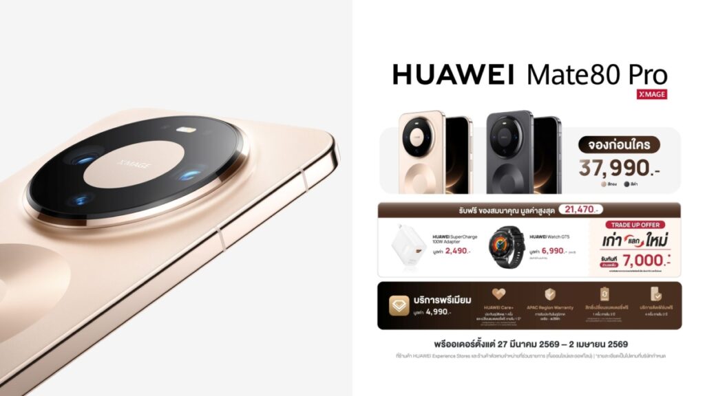 หัวเว่ย คอนซูมเมอร์ บิสสิเนส กรุ๊ป (ประเทศไทย) เปิดพรีออเดอร์สมาร์ทดีไวซ์เรือธง 3 รุ่นใหม่ล่าสุด ตอบโจทย์ครบทุกไลฟ์สไตล์ ทั้งสายถ่ายภาพ สายฟังเพลง และสายสปอร์ต ได้แก่ HUAWEI Mate 80 Pro นวัตกรรมเรือธงกล้องเลนส์เสริมสีจริง ถ่ายภาพสีสันสวยสมจริงทุกสภาพแสง หูฟัง HUAWEI FreeBuds Pro 5 พร้อมระบบตัดเสียงรบกวน Dual-Engine ด้วย AI อัจฉริยะ และ HUAWEI WATCH Ultimate 2 Green Edition สมาร์ทวอทช์กอล์ฟไฮเอนด์เพื่อสายกอล์ฟตัวจริง รับข้อเสนอสุดพิเศษเฉพาะช่วงพรีออเดอร์ ตั้งแต่ 27 มีนาคม 2569 เป็นต้นไป